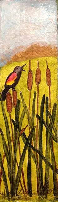 Kimberly Baxter Packwood July 24, 2017 Red Winged Black Bird Kimberly Baxter Packwood July 24, 2017 Acrylic paint and ink on Khadi paper, that is backed with canvas. 2x7 inches.