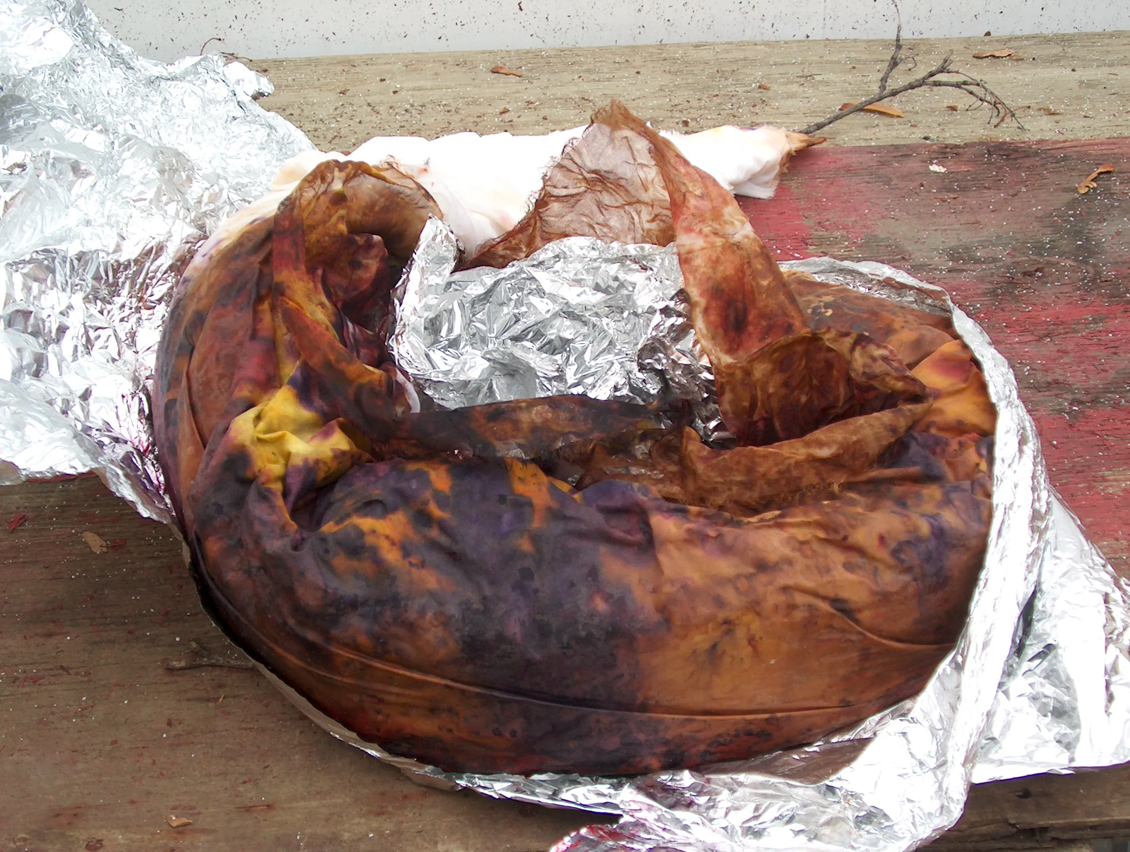 Lay out your fabric, sprinkle with dye stuffs such as onion skins, finely ground tree barks, walnut shells, etc., wrap tightly, soak with vinegar, wrap tightly in aluminum foil, or plastic wrap, and place in a sunny area that gets really hot, like your garden shed roof, or deck off of your house.